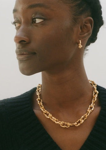 Inspired by Italian poet Dante Alighieri’s Divine Comedy, London-based scholar and self-taught artisan Rosh Mahtani’s label creates modern heirlooms immersed in an enticing aura of myth. Each individual piece corresponds to one of Alighieri’s poems, a contained narrative in miniature. Imperfect and imbued with a tinge of melancholy, each immaculately depleted, amorphous necklace, bracelet, or set of earrings captures a sense of time in motion and the evacuated offerings of a lost world. Surreally melted portraitures and vague, sinewy forms also speak of the grand mysteries still left in the contemporary era, the extant possibility of one's apotheosis through an epic journey of distances, battered creatures, passionate mistakes, and self-deceptions. Hell, purgatory, and paradise are alluded to in flashes of gold-filled chains, sterling silver, gold-plated bronze and baroque pearls. Handcrafted in London with lost wax casings, Alighieri women's jewelry is made to order, ensuring each piece enjoys an individuated personality, and is so ready to begin a unique, irreplicable journey with the wearer.